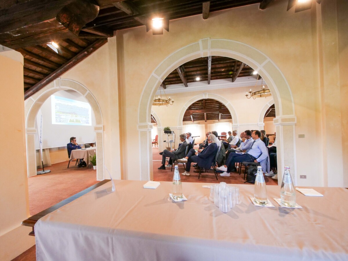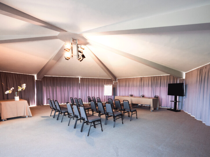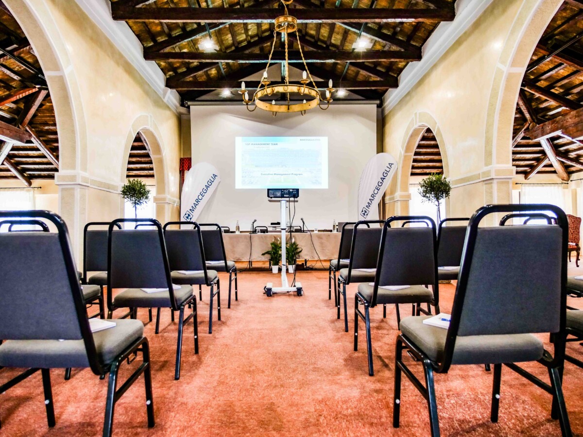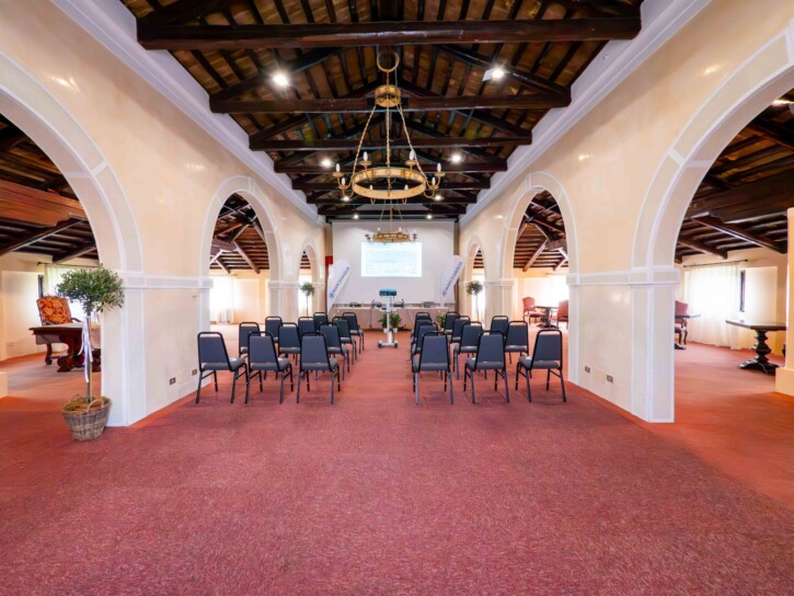 L’Hotel e la sala, situata sulla torretta, sono affacciati sul Campo da Golf con una vista mozzafiato. La sala è dotata di Wi-Fi veloce e flip chart, su richiesta attrezzatura audio e video.